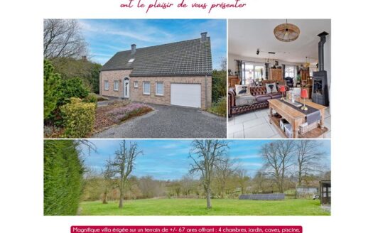 Une propriété rare où l’espace devient un art de vivre ! Il y a des maisons… et puis il y a celle qui raconte une histoire. Construite +/- en 2002 par ses premiers et uniques propriétaires, celle élégante villa 4 façades a été pensée avec soin, avec cœur et avec exigence. Mais ce qui vous saisira avant tout…c’est son terrain, plus de 67 ares ...