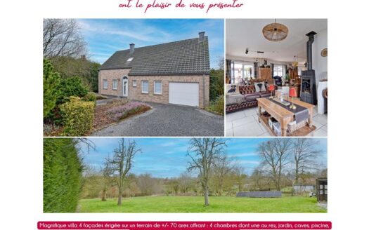 Une propriété rare où l’espace devient un art de vivre ! Il y a des maisons… et puis il y a celle qui raconte une histoire. Construite +/- en 2002 par ses premiers et uniques propriétaires, celle élégante villa 4 façades a été pensée avec soin, avec cœur et avec exigence. Mais ce qui vous saisira avant tout…c’est son terrain, plus de 70 ares ...
